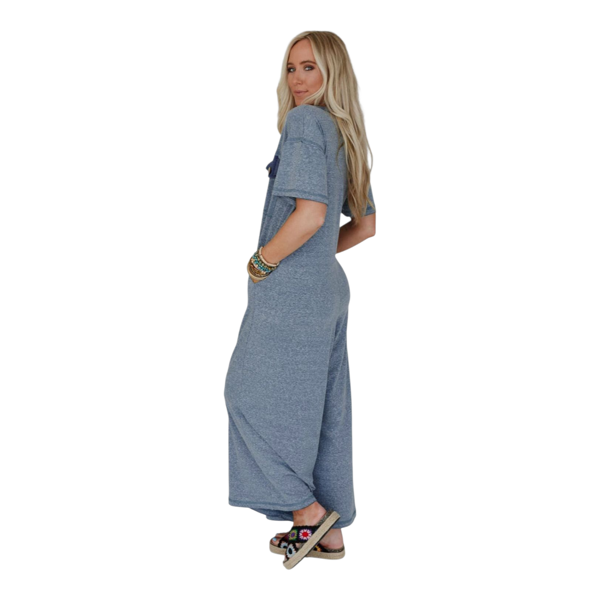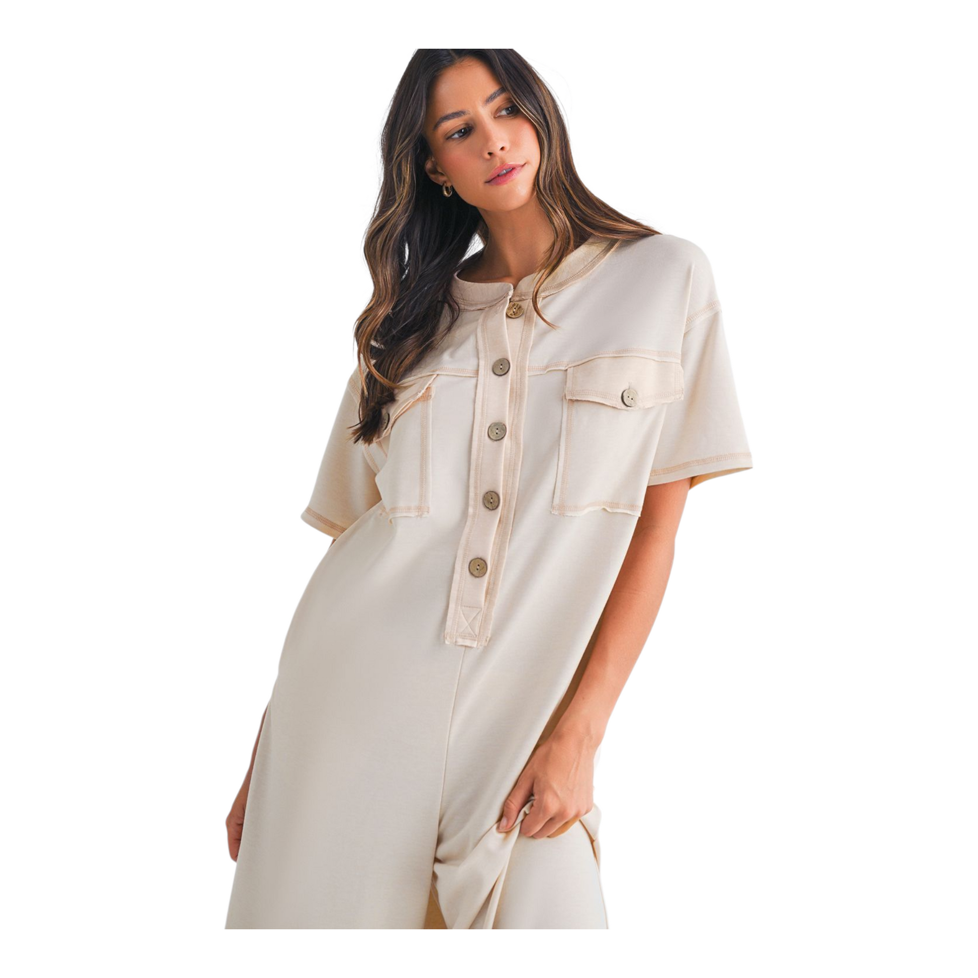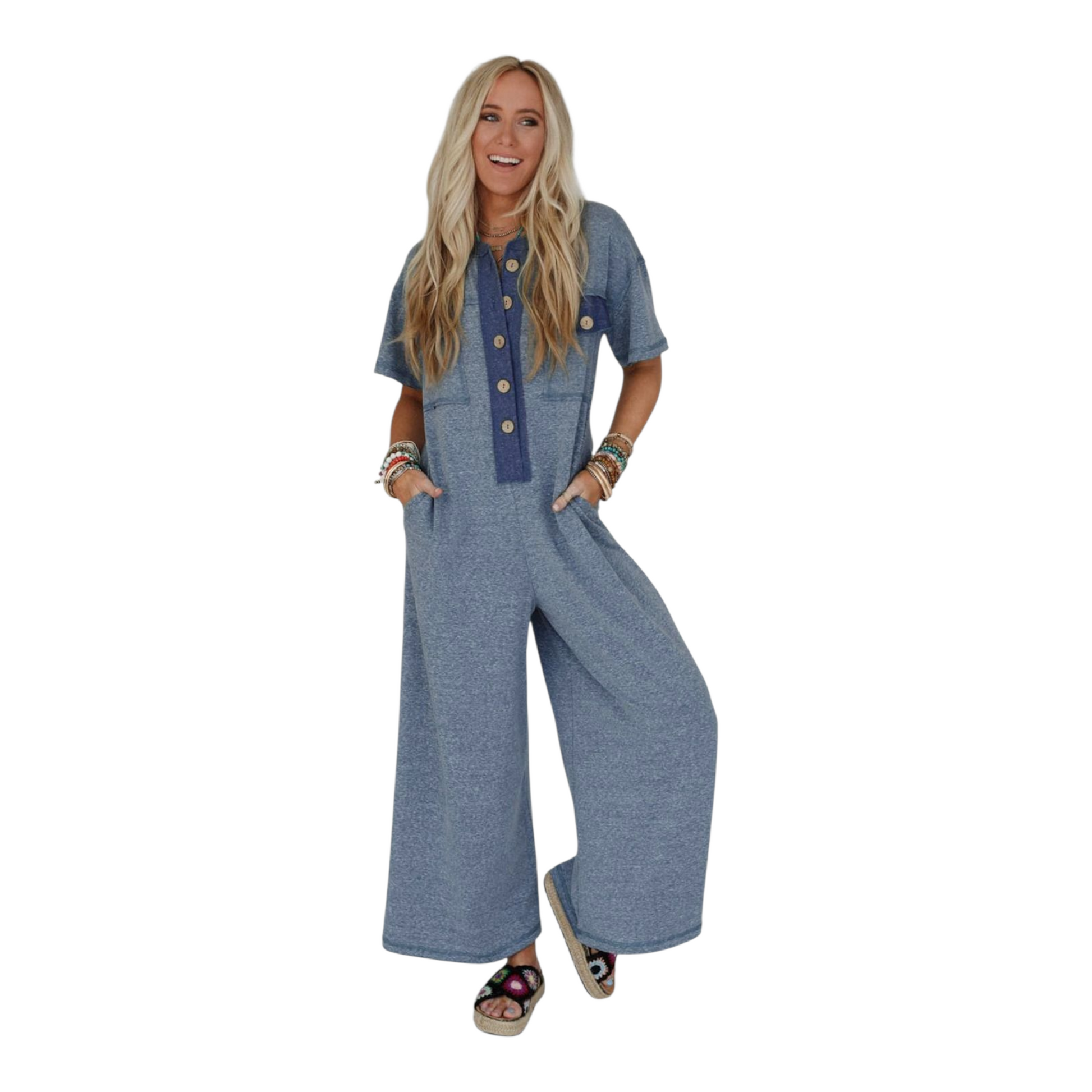 Embrace ultimate comfort and a relaxed aesthetic with this stylish wide-leg jumpsuit. Crafted from a soft, stretch terry blend of 65% Cotton, 33% Polyester, and 2% Elastane, it offers an easy, breathable feel perfect for all-day wear. The design features a unique colourblock placket and chest patch pockets, accented by oversized button detailing for a touch of casual charm. With a loose-fitting top, short sleeves, and a flattering wide-leg silhouette, this jumpsuit is effortlessly chic. Functional side slip pockets add convenience, making this durable, versatile piece ideal for casual outings, weekend relaxing, or layering.