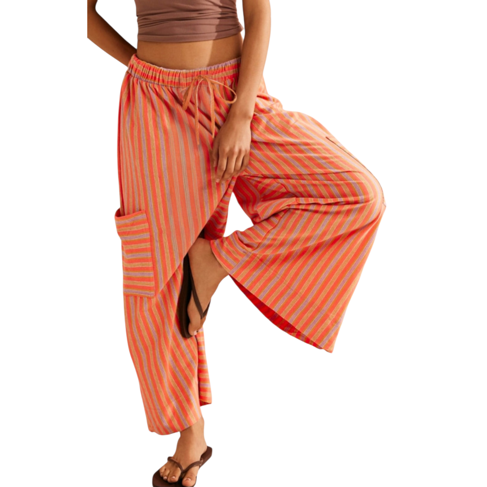 Elevate your everyday style with these Striped Wide-Leg Cropped Palazzo Pants, designed to offer both sophistication and comfort. Crafted from 100% polyester, the lightweight fabric provides a soft, fluid drape that moves beautifully throughout the day. The vibrant vertical stripes create a chic, elongating effect, while the cropped wide-leg silhouette delivers a breezy, relaxed feel ideal for warm weather. Functional side pockets enhance practicality, making these pants perfect for daily wear or effortless weekend styling. Finished with an adjustable drawstring waist, they provide a custom fit that complements their refined yet easygoing design.